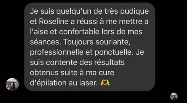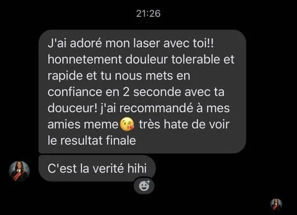 La plupart des clientes trouvent le traitement beaucoup plus tolérable que la cire. Grâce au système de refroidissement et à l’embout spécial du LightSheer, les sensations sont réduites. Certaines zones sensibles peuvent piquer un peu plus (ex. maillot), mais c’est très rapide et bien supporté.